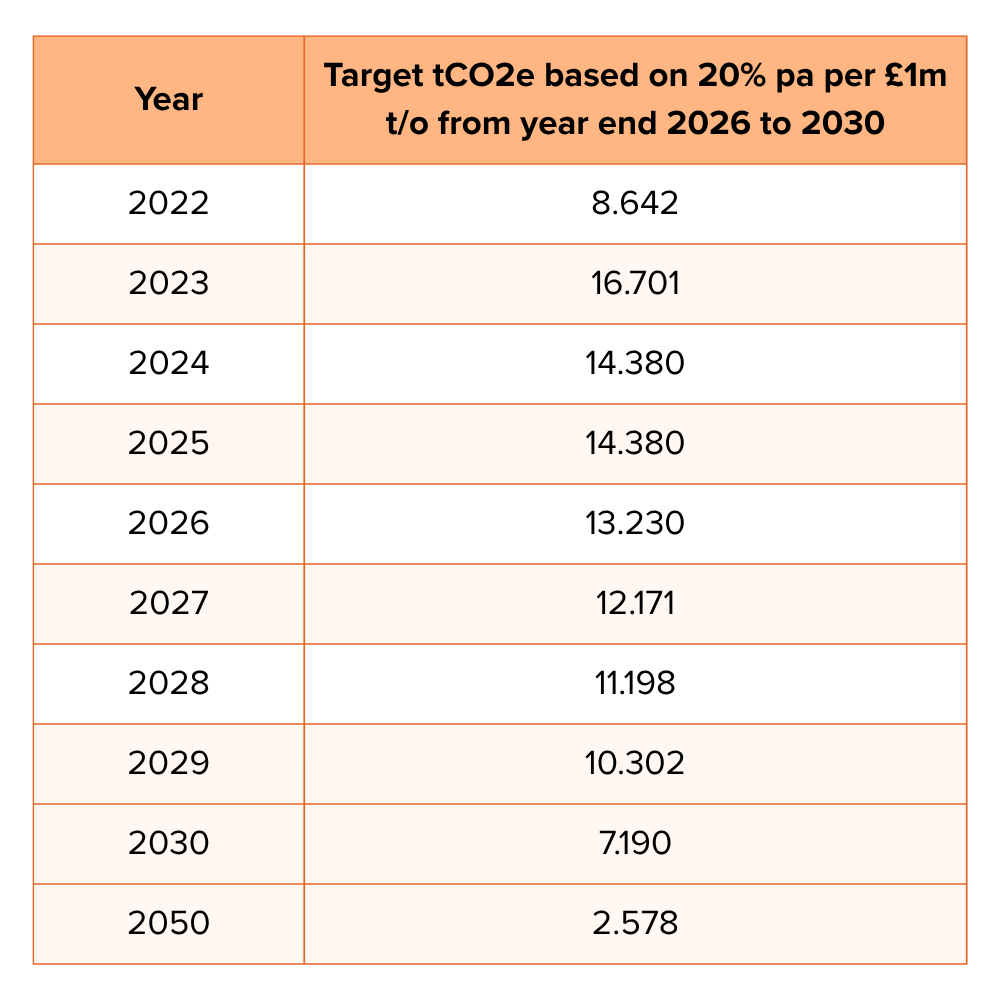 Our overall emissions intensity target aims to reduce emissions to ≤7.19 tCO₂e per £1M turnover by 2030.